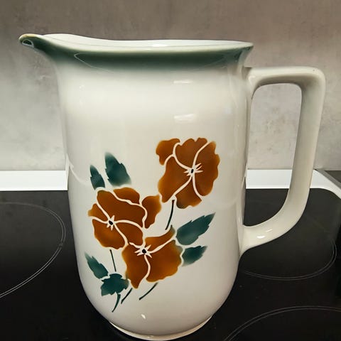 kannu, maitokannu, ST 2-malli, korkeus 20cm, suuaukon halkaisija ulkomitta 11,5cm, paino 820g, elämä kolhinut pohjarenkaaseen iskemän ja yläreunan lasitteeseen jälkeä, ajan patinaa tummentumana myös kahvan yläreunassa ja kannun alareunassa. Käytetty, mutta kaunis.