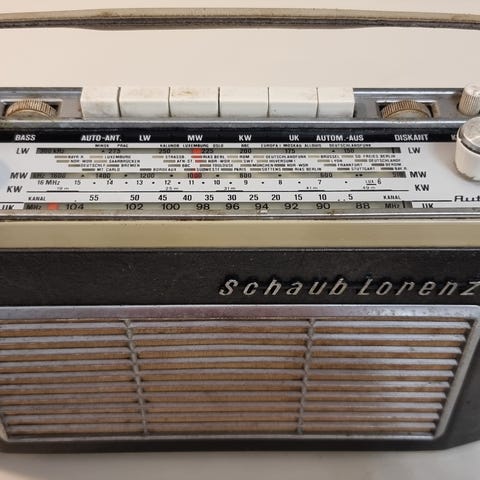 Harvinainen Nordmende Globetrotter "Vintage"-matkaradio yhä siisti ja hyvässä kunnossa, myös antenni. Hyvä ääni ! Asteikkopolttimo ei pala, pitäisi vaihtaa, samalla voisi tarkistaa muiden aaltoalueiden siirtolangat; kotimaisia ULA-FM-asemia kuuluu useita hyvin 96 MHz asti. Kaikki aaltoalueet (FM-AFC, ULA-FM, 13-80m lyhyet, S 80-200m, M ja L), teho 2.5 W, toimii suurilla 5 x LR20 - 1.5 V paristoilla tai verkkolaitteella. Paristokäyttö on hyödyllinen etu sähkökatkojen aikana ! Paristot nyt mukana asennettuna. Tämä radio oli aikanaan Nordmende-malliston kallein, valmistettiin vain vuosina 1966-68 (Maksoi 460 DM). Valmistenumero: I 01-011833 , Vuonna 1966 ostettu. Mitat 310 cm x 105 cm x 209 cm (12.2” x 4.1” x 8.2”). Vanhalla laitteella ei tietenkään takuuta, eikä palautusta.