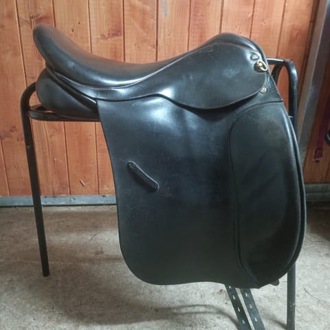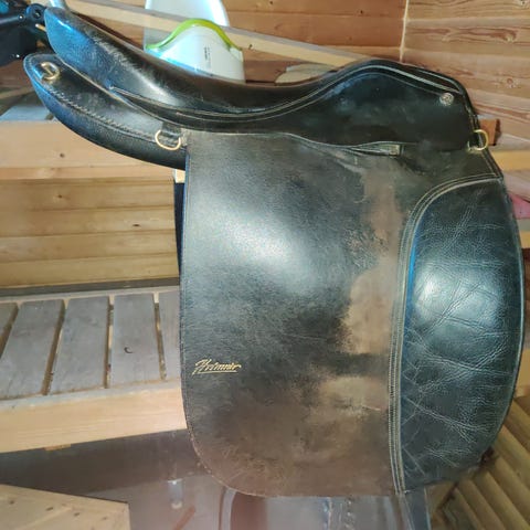 Leveä, pari osumaa saanut ja vähän korjattu satula suorahkoon selkään.