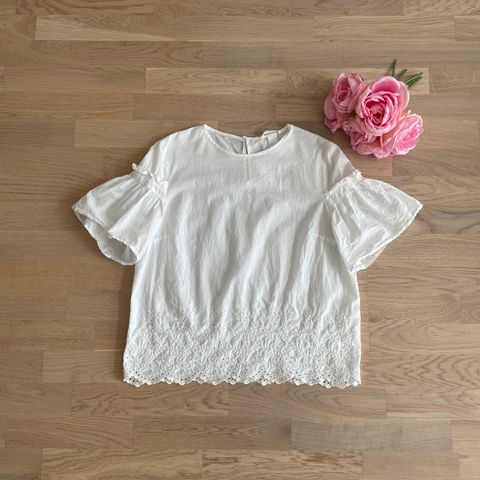 Valkoinen pitsipaita, ei kokomerkintää, mutta vastaa kokoa 40. Siistikuntoinen.