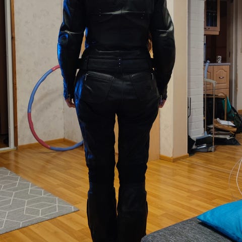 Käyttämätön 2-osainen nahkapuku, yhdistetään toisiinsa vetoketjulla.