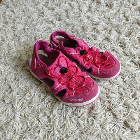 Kuvan Viking -sandaalit, koko 34, pohjallisen pituus noin 21 cm. Uutena ostetut, yhdellä kesän käytössä olleet laadukkaat, tukevat sandaalit, kiinnitys kolmella tarralla. Kengissä ei ole vikoja, kaikki toimii. Pohjallisesta näkee, että ovat olleet käytössä, muuten oikein siistit. Nouto tai postitus. Jos löytyy muuta, yhdistetään samaan lähetykseen.