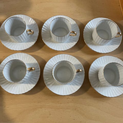 Mukaan annetaan lisäksi kuusi kuppia, joiden kunto vaihtelee. Osassa kulumaa kultauksessa, mikä ei estä käyttöä. Parissa pieni särö.