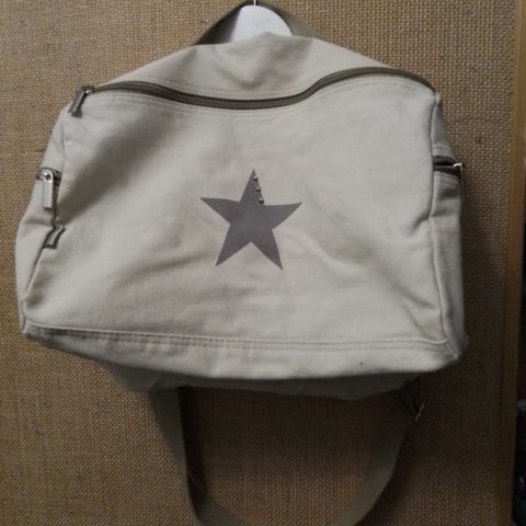 Valkoinen Kankainen Laukku, suulla vetoketju, sisäpuolella vetoketju taskut, koko 28.5x44 cm, ehjä ja siisti.