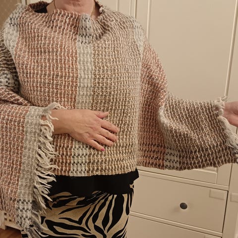 Luonnonvalkoisesta puuvillalangasta, jossa mukana hillitty kullanhohtoinen kiiltosäie, helmineuleena kudottu kevyt ja juhlavakin hapsureunainen ponco. Sivuosien pituus 35 cm + 7 cmn hapsut. Hinta 15 euroa.