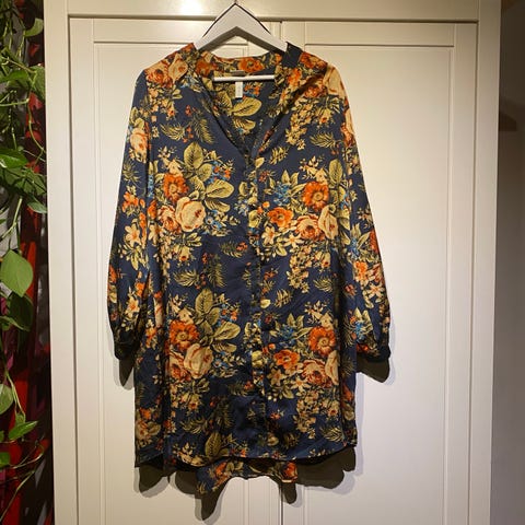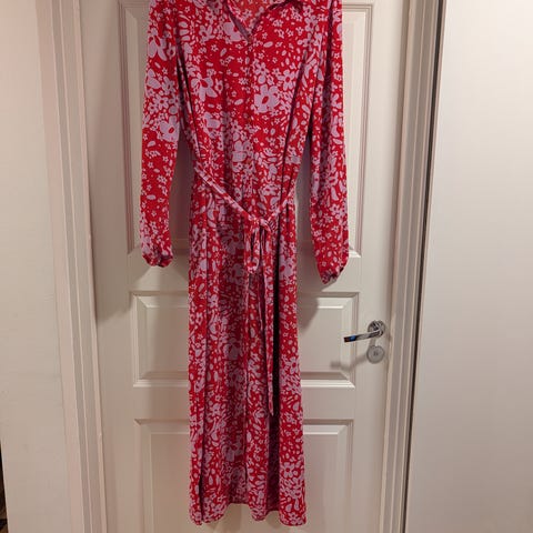 Pitkä kukkamekko Ellokselta tilattu. Kokoa 46/48. Polyesteriä 94% ja 6% elastaania. Mekossa on sisäänommeltu vyö, jota voi kiristää. Kai-kai 57cm ja olka-helma 97cm.