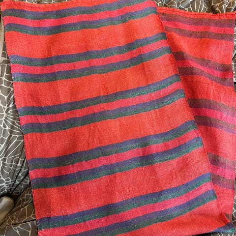 Kaksi lilaa punaisella kirjailtua pellavaliinaa yht