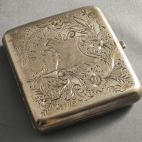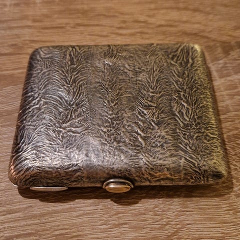 Hopean värinen ,metallinen rasia/kotelo,76v.vanha,savukkeille tarkoitettu,lev.11cm ja pit.8cm,vanha karttakuva kannessa,hintap.20e,Käpylässä