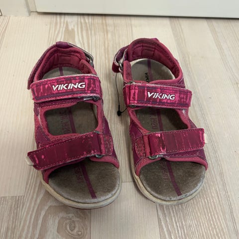 Myydään kahden lapsen käyttämät Viking sandaalit kokoa 27. Pohjan pituus kantakuopan takareunasta kärkeen 17 cm. Kankaassa kulumaa jonkin verran kuten kuvista näkyy. Tarrat napakat.