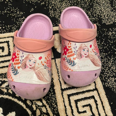 Frozen "crocsit" kokoa 27. Pohjan mitta noin 16,5 cm, vaikea mitata tarkasti. Kuvassa kulumaa mutta yleisilme siisti. Toisessa kengässä toinen remmi irronnut toisesta päästä. Kiinnitetty kuminauhalla ja toimii.