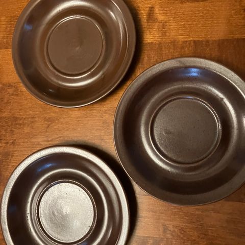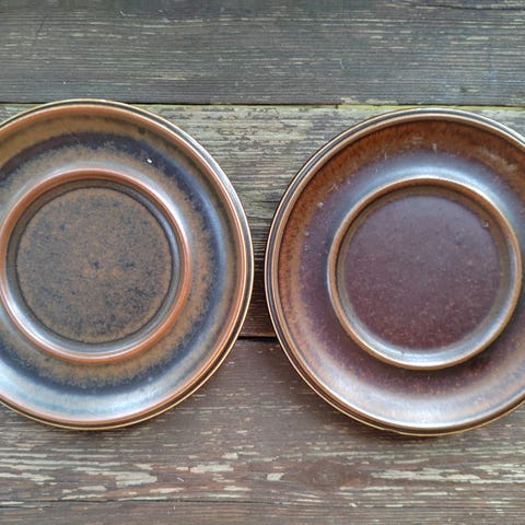 Kuvienmukaiset erittäin hyväkuntoiset Arabia Ruska teekuppien aluslautaset ja kuvasta poiketen kolme kahvikupin tai mokkakupin aluslautasta 2,-/kpl.