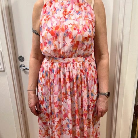 Aikoinaan juhliin ostettu, mutta sattumien kautta juhlat jöi juhlimatta ja mekko käyttämättä. Takana nyöritys, joten menee 42-46 kokoiselle helposti. Helma noin nilkkapituinen 167cm pituiselle.