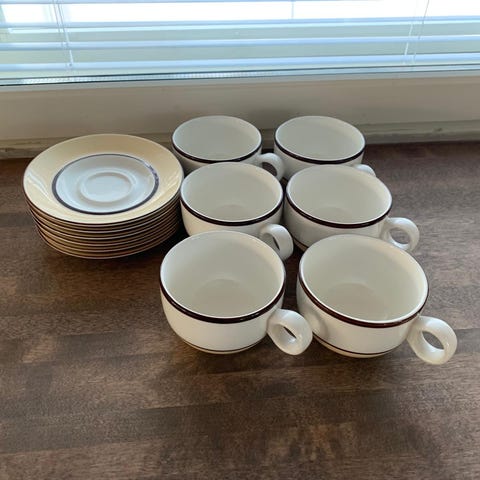 Kuusi kahvikuppia, pullalautaset, ruokalautaset, soppakautaset, kermakko ja sokeriastia. Kaikki erinomaisessa kunnossa.