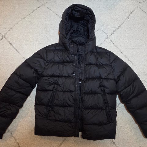 Oikein siistikuntoinen musta toppatakki, paljon taskuja. Edessä molemmin puolin nepparilliset rintataskut, sekä avotaskut sivuilla, vasemmassa hihassa nepparillinen tasku ylhäällä. Vetoketjulliset povitaskut molemmin puolin sisäpuolella. Kiinnitys edestä vetoketjulla sekä neppareilla. Hihansuissa myös kiristysmahdollisuus neppareilla. Pieni pystykaulus, ei huppua. Päällinen nylon / polyester, vuori polyester.