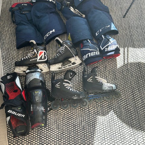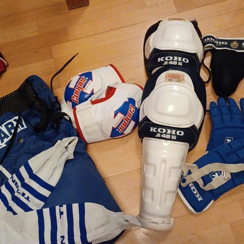 Jääkiekkovarusteet, kokoni on 176,5cm pitkä ja n.83kg sisältää kaksi kypärää, kaksi tai kolme kaulasuojaa, kahdet sukat mustat ja valkoiset, 3-4kpl treenipaitoja, kahdet ranne pehmusteet, hartija suojat, selkä/rinta panssari, teippiä, ala selkä tuki, jääkiekkokassi, housut, yms muuta mitä on kuvassa, toimivat hyvin, minulla oli alunperin CCM suojat ja päivitin melkein kaikki paremmin istuviin Bauerin tuotteisiin , veikkaan että sopii henkilöstä riippuen 172cm-179cm pitkälle