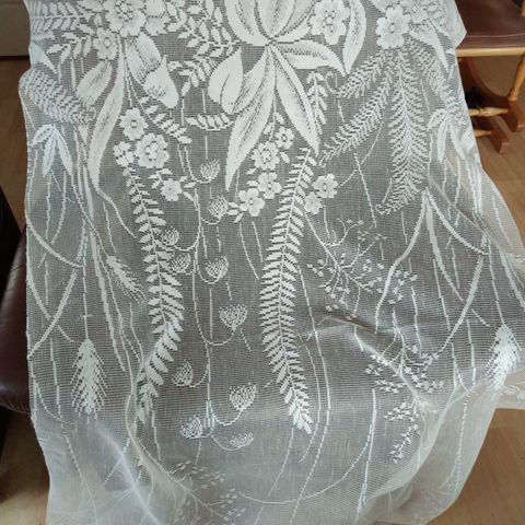Valkoinen pitsimäinen oviverho, molemmissa päissä ohuelle vaijerille kuja. Leveys 114 cm, korkeus 89 cm. Käy myös diili. Ilm. 13.6.