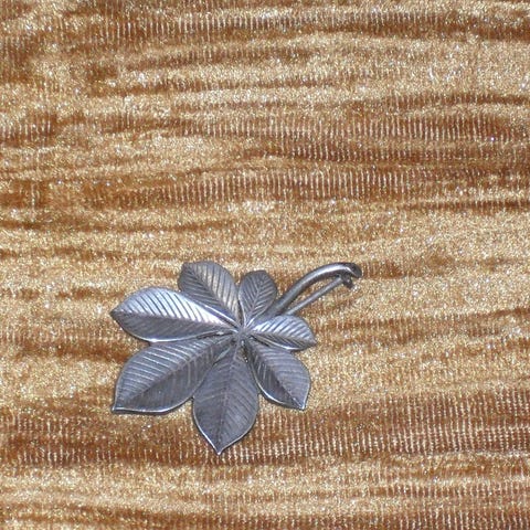Myydään hienostunut lehti rintakoru. Mitat 5,5x3,5cm.