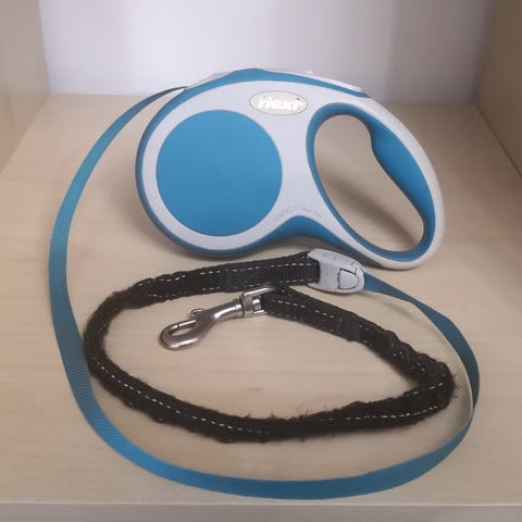 Käyttöä nähnyt, mutta käyttökelpoinen sininen kelatalutin pienelle koiralle. Leveä nauha, jonka pituus noin 4m30cm. Nauhaa hieman lyhennetty, kun leikattu solmuja pois.