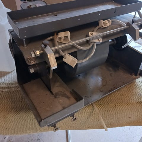 Teollinen kone (3kpl. kaksi ilman sähkömoottoria, yhteensä hinta 200€) pyöreälevyhionta korukiven hiontaan. Kone on valmistettu kestävästä materiaalista ja siinä on kaksi pyöreää levyä. Punainen väri tekee siitä erottuvan työympäristössä. Soveltuu erinomaisesti kivien hiontaa.