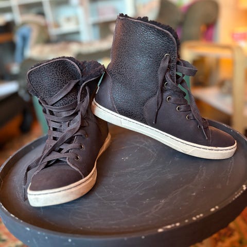 Kerran pari pidetty, näkee kyllä pohjistakin. Lammaskarva vuoraus kokonaisuudessaan sisällä paitsi sisäpohja. Kokomerkintä on 36 mutta ovat pienemmät kun sisämittakin näihin merkitty 220 joka siis vastaa 35 kokoa mondopoint mittojen mukaan. Se vain että pentukoira hieman ehti hieman tätä tuosta karvareunasta retuuttaa joten toisen reunan karvaa pitäisi hieman liimailla kiinni, suutarilla tai itse ja ei se todellakaan ole niin paha ole kuin miltä se kuulostaa...Reunuksen karvahan on siis muutenkin "liimattu" siihen". Toiseksi viimeinen kuva on kyseistä kohdasta ilman että nostan sitä repeymää ylös ja viimeinen kuvassa näkyy kun nostanut sen kyseisen kohdan ylös. On huomioitu jo hinnassa! Ei sovituksia, ei toridiiliä. Nouto tarkka aika etukäteen sovitusti ma-pe kl.10-16 Hki 88 tai postitse pakettina.
