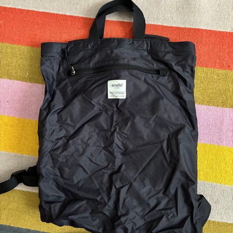 Musta Brunelli reppu. Päätaskussa vetoketju, sisällä vetoketjutasku ja kaksi avotaskua. Etupuolella vetoketjutasku ja läpällinen (magneetti) tasku. Takapuolella vetoketjutasku ja päädyissä avotaskut. Olkahihnat saa yhdistettyä vetoketjulla, jolloin reppua voi kantaa yhdellä olalla (kts. kuvat 3 ja 4).