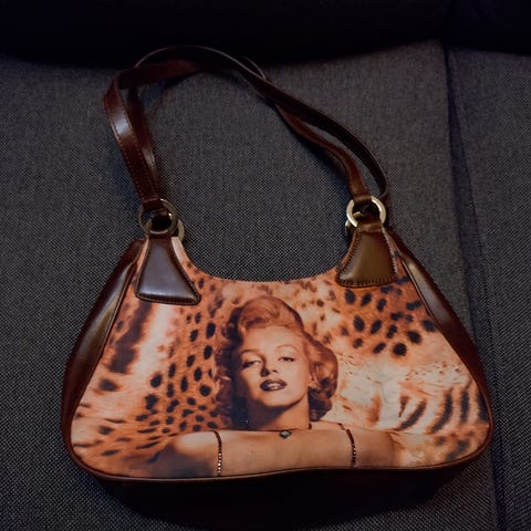 Musta Marilyn huulipunakotelo. Kuva molemmilla puolilla. Hihna kulunut. Sisältä siisti.