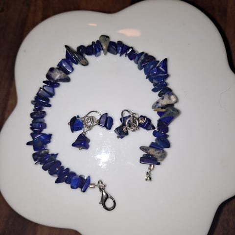 Droppformade öronklips och hänge med blå Lapis sten. Hänget är 3 x 4 cm.