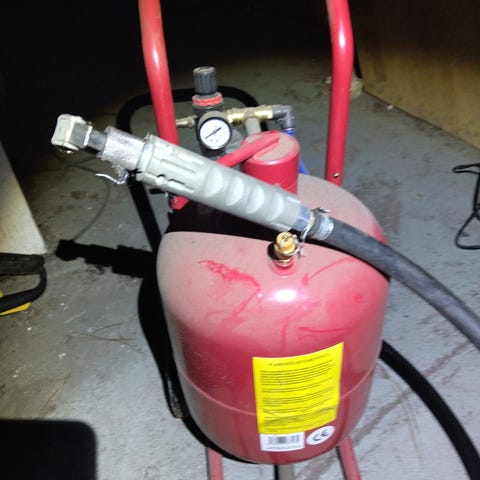 Myydään kuvan uusi hiekkapuhalluspistooli säiliöllä.