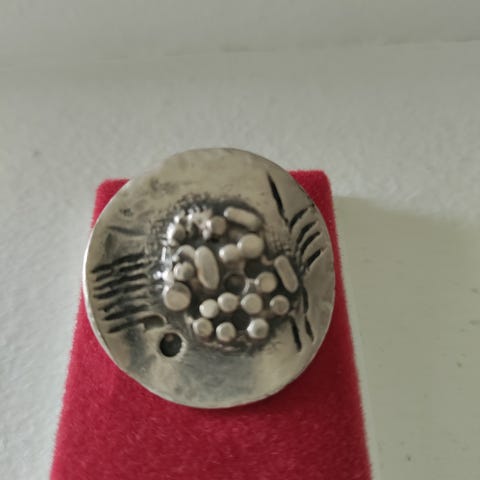 Vanha v. 1960 oleva mahdollisesti sihteerin sormus tai kauppaopistosormus, koko n. 18 ja paino 3,88, hopeaa. Kaiverrettu. Vain nouto Toppilansalmesta.