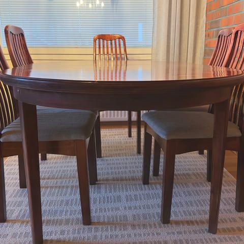 Myydään ruokailuryhmä. Pöytä+10 tuolia+10 tuolihuppua (valkoiset). Leveys 99,5 cm, pituus 220 cm, pöytälevyn paksuus 4 cm, korkeus 77,4 cm.