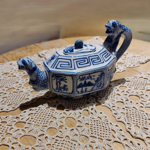 Hieno Sinivalkoinen kiinalainen teekannu lohikäärmeellä Vintage