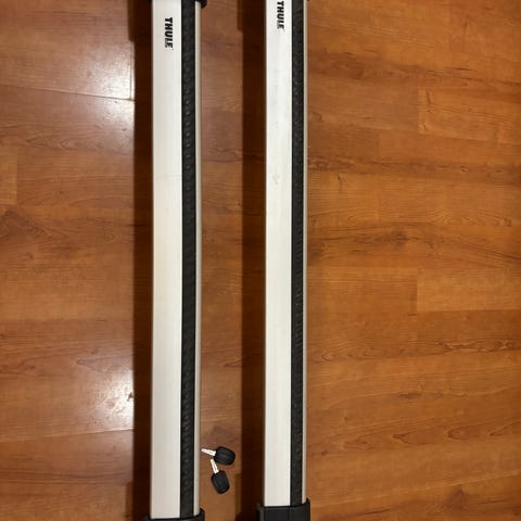 Muutamia vuosia satunnaisesti katolla olleet Thulet. Sopivat ainakin CR-V:n iv-mallin kattokiskoihin ruuvikiinnityksellä. Saattavathan nuo joihinkin muihin merkkeihin mennä. Täysi paketti ja kahdet avaimet.