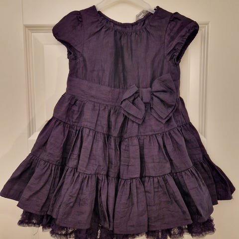 Pienen tytön lilan värinen mekko, ei koko-/valmistelappuja. Arviolta 1-1,5 vuotiaalle sopiva. Mekon pituus hartiasta helmaan 44 cm ja hihan pituus kainalosta hihansuuhun 18 cm.