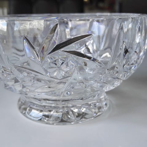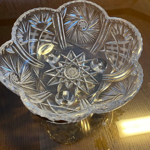 Iso kokoinen, hiottua kristallia. Bohemia, ostettu Prahasta. Halkaisija 20,5 cm. Korkeus 9 cm. Paino 1,935 kg. Saa tarjota. Nouto. Jos