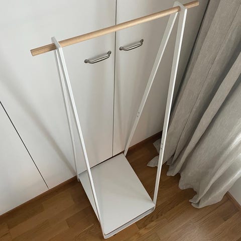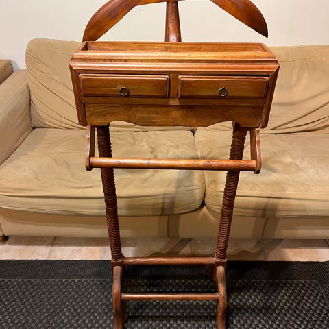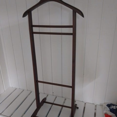 Italialainen vaaterenki 1960-luvulta, lakattua puuta ja messinkiä. Pyörät toimii. Sekä sivuilla olevat ulosvedettävät messinkinupit. Ehjä ja hyväkuntoinen, toki ikänsä mukaista kulumaa näkyvissä paikoitellen. Valmistaja Brevettato. Ostettu antiikkiliikkeestä. Korkeus 103cm, leveys 45, syvyys 32cm