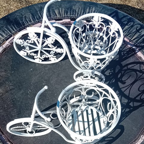 Myydään valkoinen rautainen kukkateline viidelle ruukulle. Ruostetta vähän ja yksi rengas hiukan irti rungosta. Kumpikaan ei haittaa käyttöä ja tukevasti pysyy pystyssä. Kiva näin tai pienellä ehostuksella ihan priima.