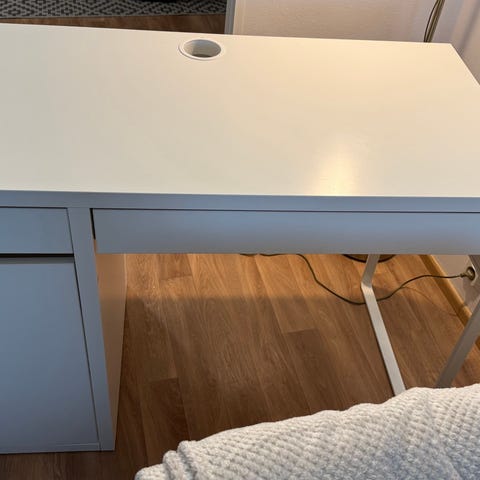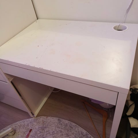 Ikean valkoinen pöytä, joka on itse päällystetty marmorikuvioisella muovilla.
