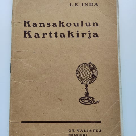 1) I.K.Inha: Kansakoulun Karttakirja, pienoinen opas avarassa maailmassa, sommitellut ja piirtänyt I.K.Inha, Helsingissä, Kansanopettajain O.Y. Valistuts 1909, 48 värillistä kartta- ja tilastosivua, 17,5 x 26.5 x 8cm, kunto ikäänsä nähden hyvä, kansisivu kulunut, Hinta 30eur