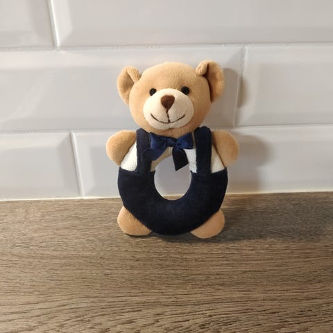 Suloinen muovinen Nalle-helistin. Pääosan väri keltainen, kuva vääristää sävyä. Käytön jälkiä löytyy. Samaa sarjaa kuin Hymy-helistin.