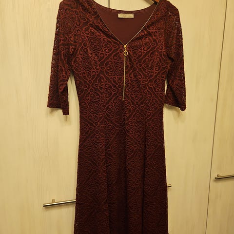 Vaalea roosanvärinen pitsitoppi, jossa piilovetoketju sivulla ja liukas joustava vuoritus. Rypistymätöntä kangasta,joka on joustavaa. Kainalo-kainalo 47cm.
