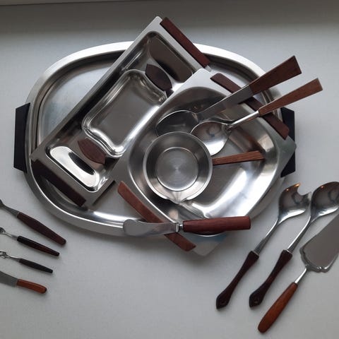 Teak kahvalla olevat paistiveitsi ja -haarukka / paistiveitsi ja haarukka.