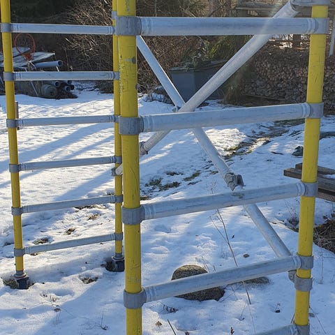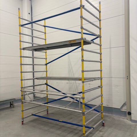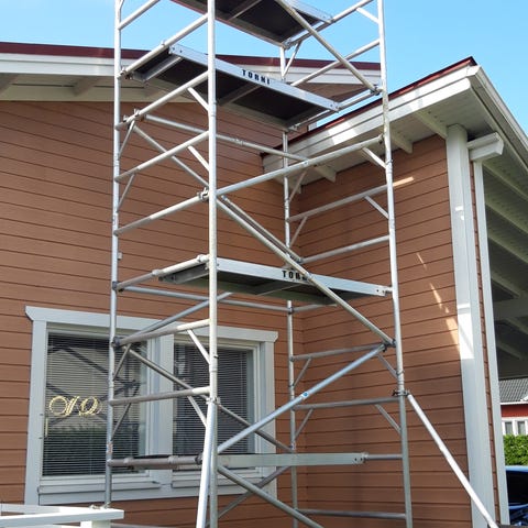 Annetaan vuokralle kevyet Instant Upright -malliset alumiinitelineet. Käytettävissä olevilla osilla saa rakennettua telineet, joissa ylin työtaso noin 6m korkeudessa eli työkorkeus noin 8m. Nämä ovat ns. kapeat telineet eli työtason pituus noin 180cm ja leveys 60cm. Soveltuvat hyvin esim. talon maalaamiseen.