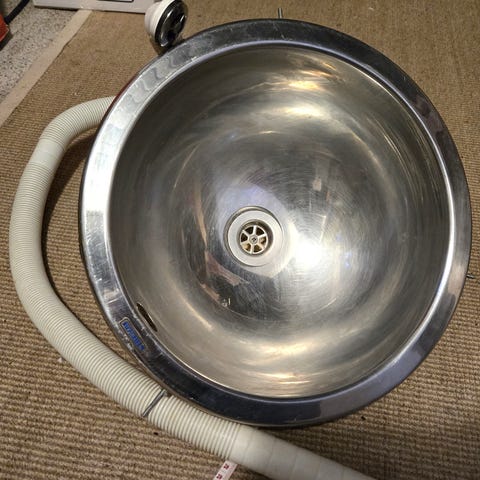 Myydään uusi käyttämätön teräsemaliallas, ilmeisesti kaapin päälle asennettava.