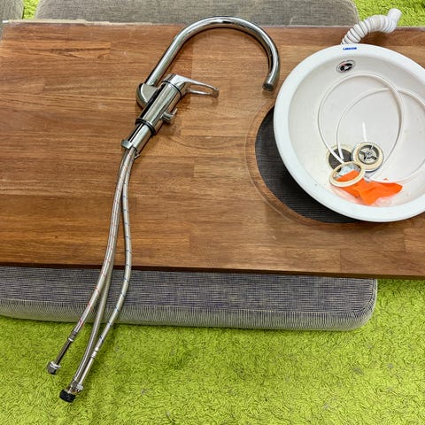 Mukana vesilukko sekä ylivuotoputki sekä joku pieni nippelipussi