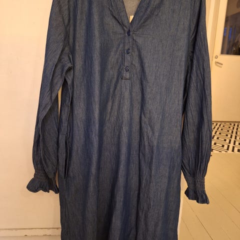Fransa imarteleva kapealinjainen farkkumekko, ohutta farkkua. Vetoketju edessä, vetoketjuhalkio takana, kiristysnyöri helmassa. Koko XS, niukka S.