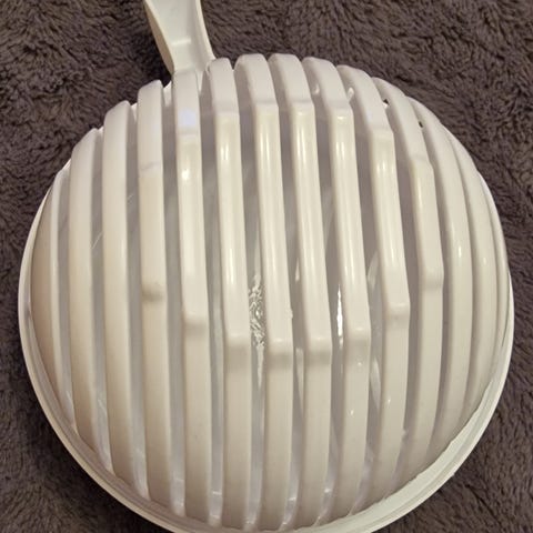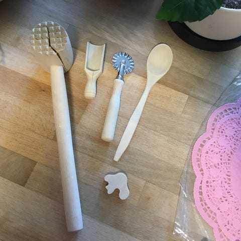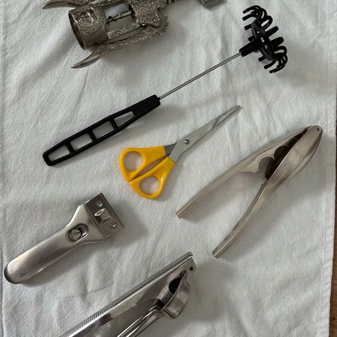 Kierrevispilä, metallinen salaattiotin, paistinlasta ja spaghettikauha .