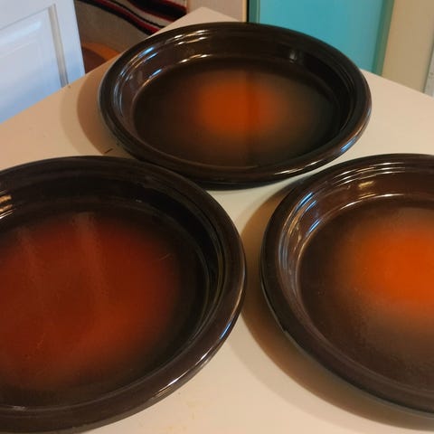 Hyvin säilyneet ruskeat emalivuoat, Arabia Wärtsilän tuotantoa, kotiutuneet suoraan tehtaalta vuosikymmeniä sitten. Vain pientä pintakulumaa. Ei leimoja.