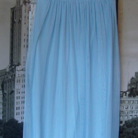 Olkaimeton malli, sivulla vetoketju. Rinnan ympärys 96cm, mekon pituus 93cm. Siisti ja ehjä. Edessä kaunis kirjailu.