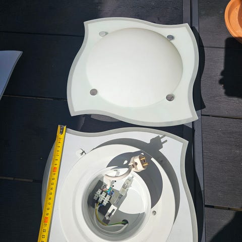 3 KPL:tta Pyöreillä lasisilla kuvuilla varustettuja kattoplafondeja. Pyöreillä loisteputkilla varustettuina. Toimivat, pystyy vaihtamaan led valonlähteen. Hinta yhteensä 35,-€