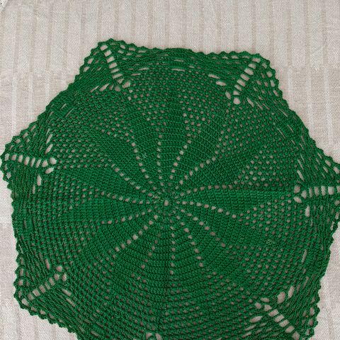 Kaksi vihreää vintage-tyylistä pientä pöytäliinaa. Virkattu ehkä 1970-luvulla. Koko noin 22 cm x 22 cm. Yhteensä 6 euroa.